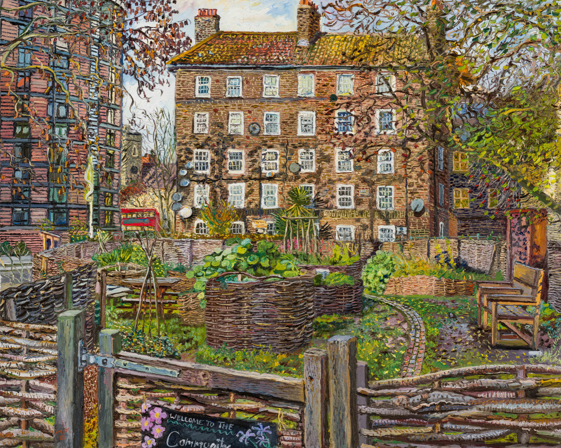 'This is the community garden, sometimes called Old Paradise Gardens. They've made it quite recently and put together all these hazel twigs – I really enjoyed painting them. I like the happy welcome sign, and the fact that it wasn't completely in the painting. The angle made a really good composition, like having the fence come towards you. It is kind of welcoming, like hands and fingers holding the garden.