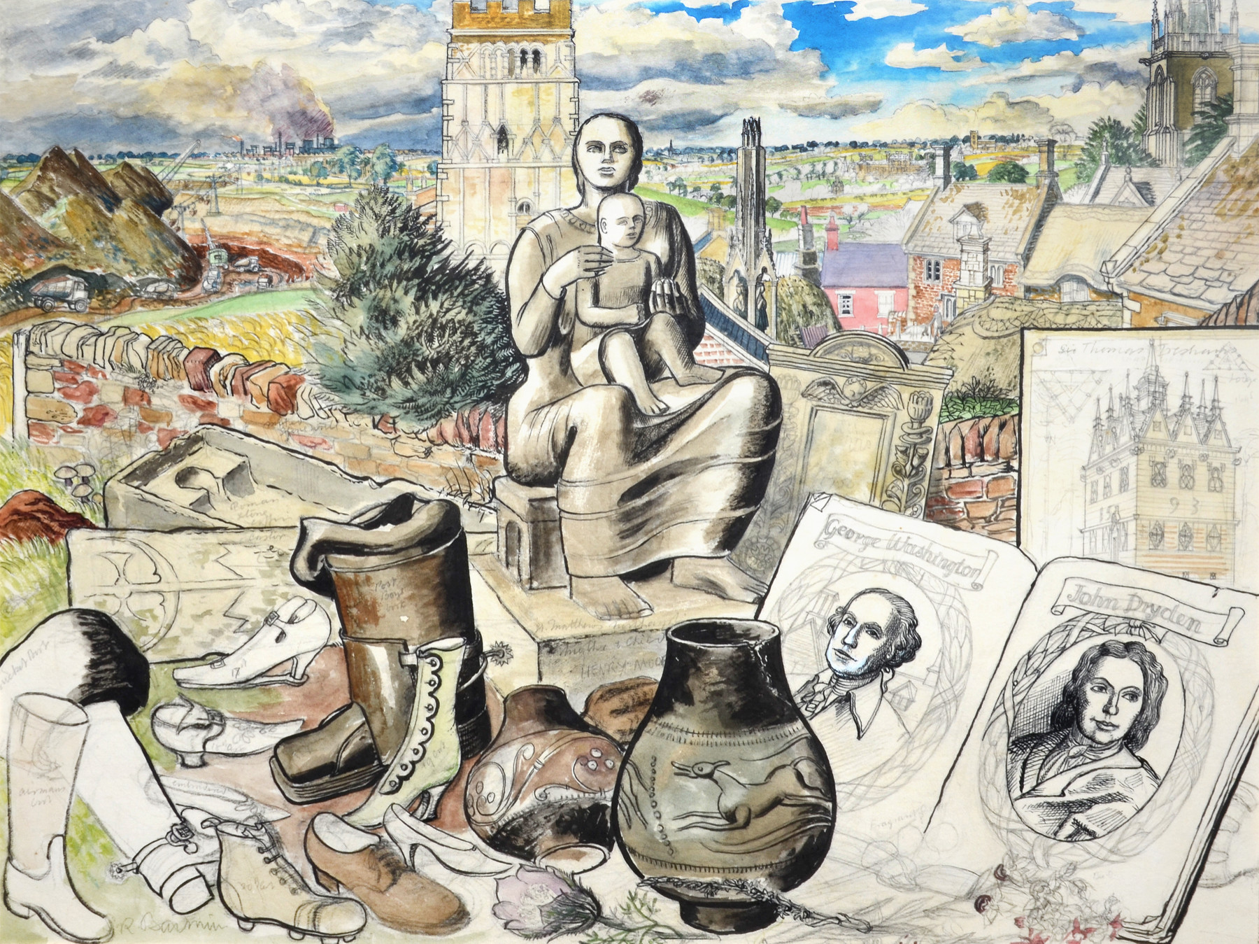 'The working drawing for Northamptonshire ... has the key to his compositional process scribbled in the margins. The proposed content is divided into the industrial side and the traditional side. The industrial side is away to the distant left – "Corby with its sulphurous smoke and giant bunsen burner; overhead bucket cables converging on Corby; open-cast iron ore quarrying: special iron ore tip lorries; corn crops growing to the edge of quarries". Over to the right is the traditional side - Queen Eleanor's Cross; the spire of a typical church, and Middleton Cheney. Between them are "fine stonework and carving on church towers, great country houses. and beautiful thatch and stone-roofed stone houses with careless patches of red brick and slate horrors." The foreground shows ancient and modern boots, a Roman stone coffin, Roman castor ware and Northamptonshire's favourite sons, George Washington and John Dryden. The powerful mass of Henry Moore's "Mother and Child" statue in St Matthew's Church, Northampton, is in the centre, but before the final illustration was completed the claims of Yorkshire took Henry Moore and his Madonna on a free transfer to the county guide of his birthplace.'