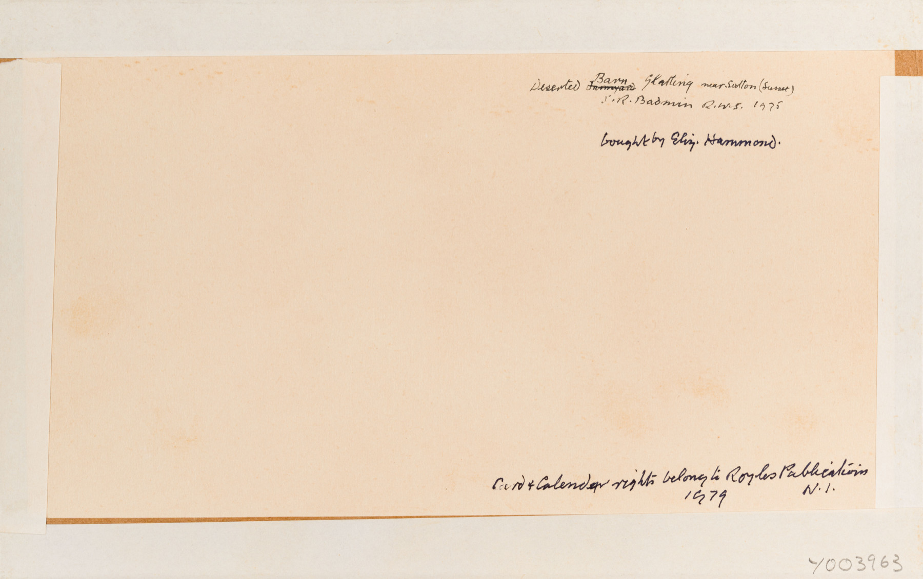 Signed and inscribed with title signed, inscribed ' Deserted Barn. Bought by Eliz Hammond. Card & Calendar rights belong to Royles Publications N1' and dated '1974' and '1975' Signed and inscribed with title and exhibition details on label on original backboard