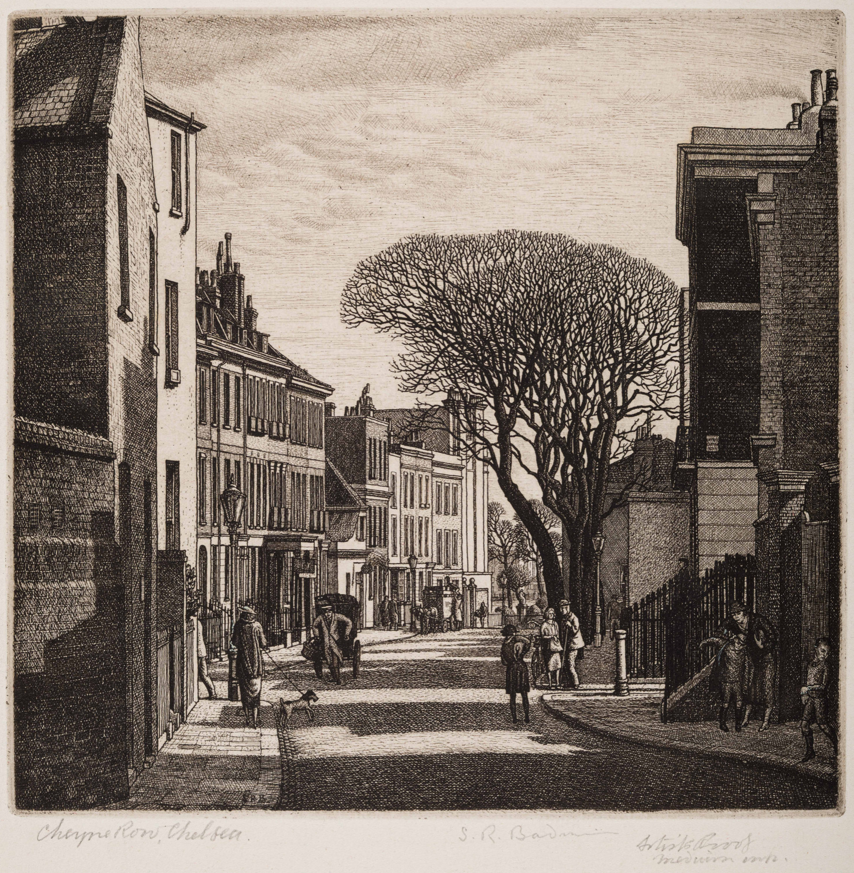 Catalogue Raisonné no: 38 From an edition of 50 Executed in 1935 and published by the Fine Art Society. This view is looking down Cheyne Row towards the Thames from Glebe Place, by the junction with Upper Cheyne Row.