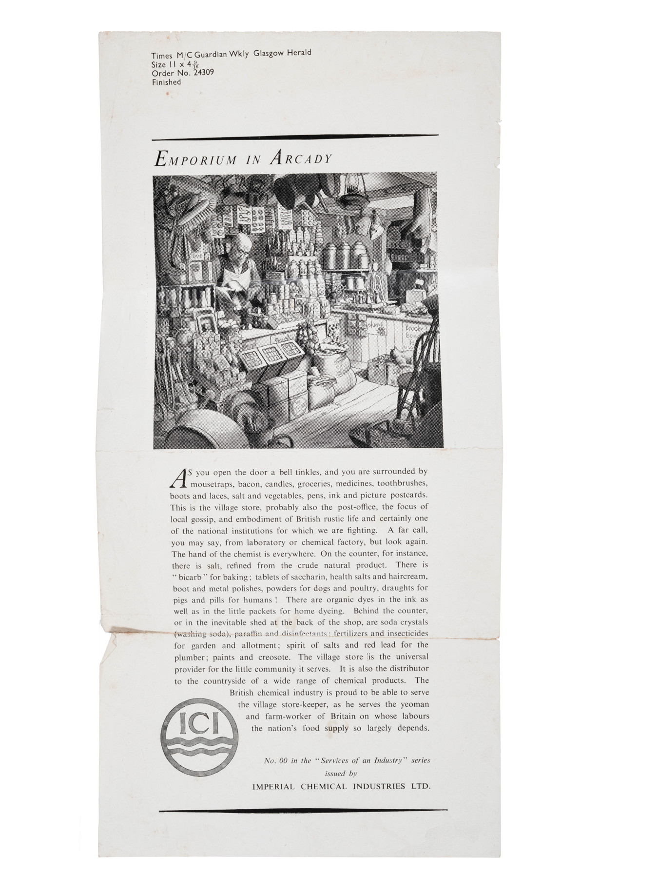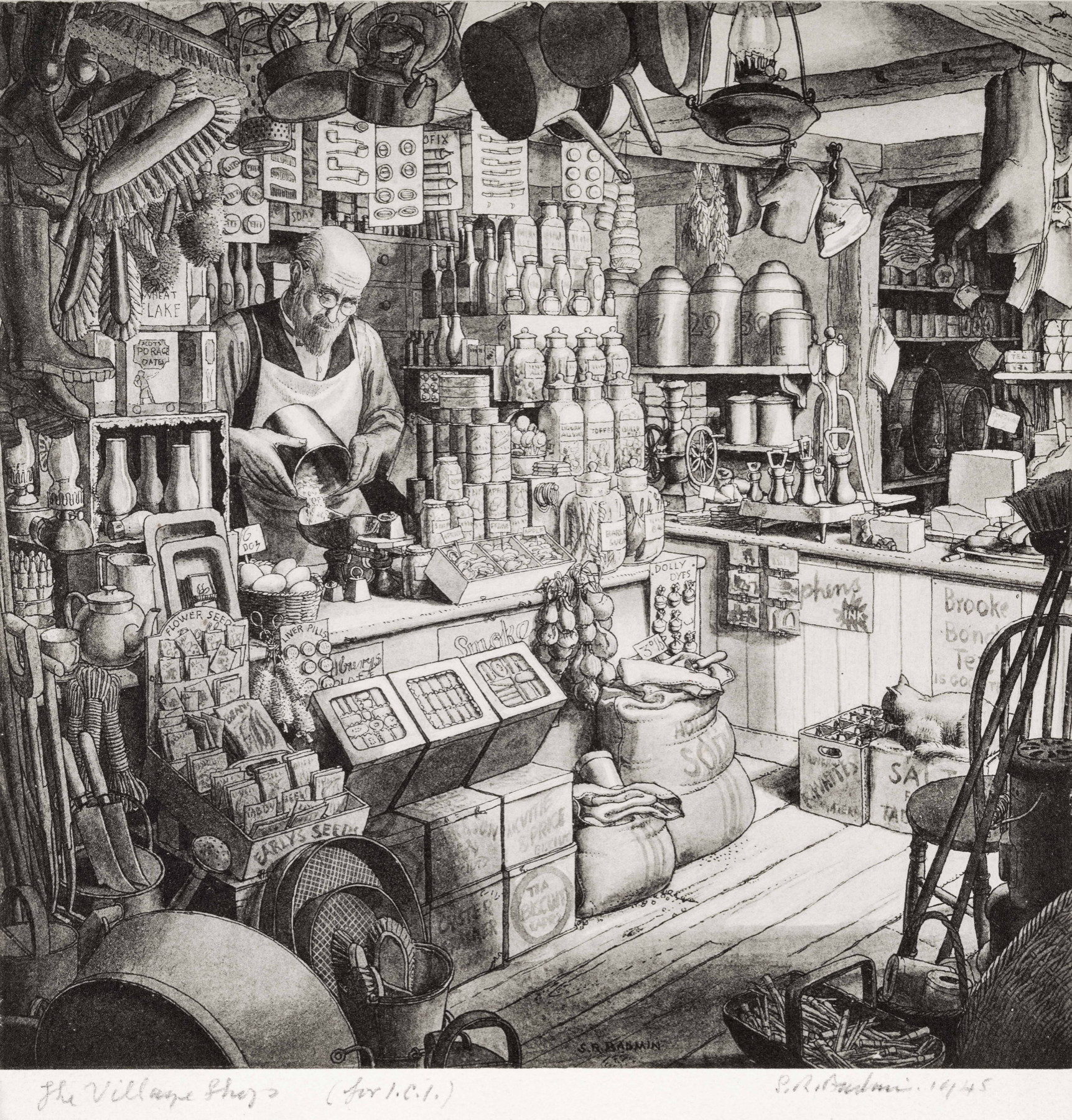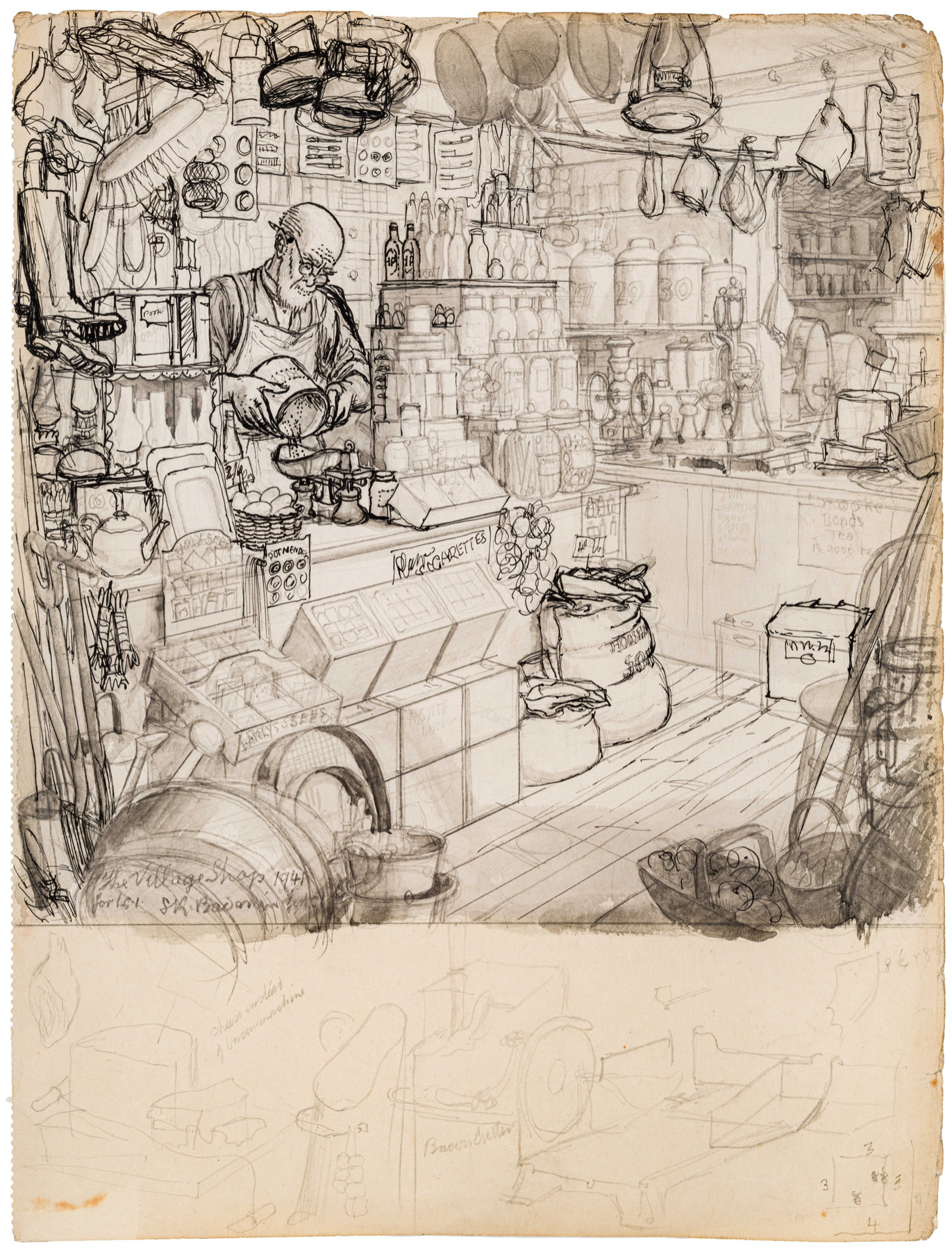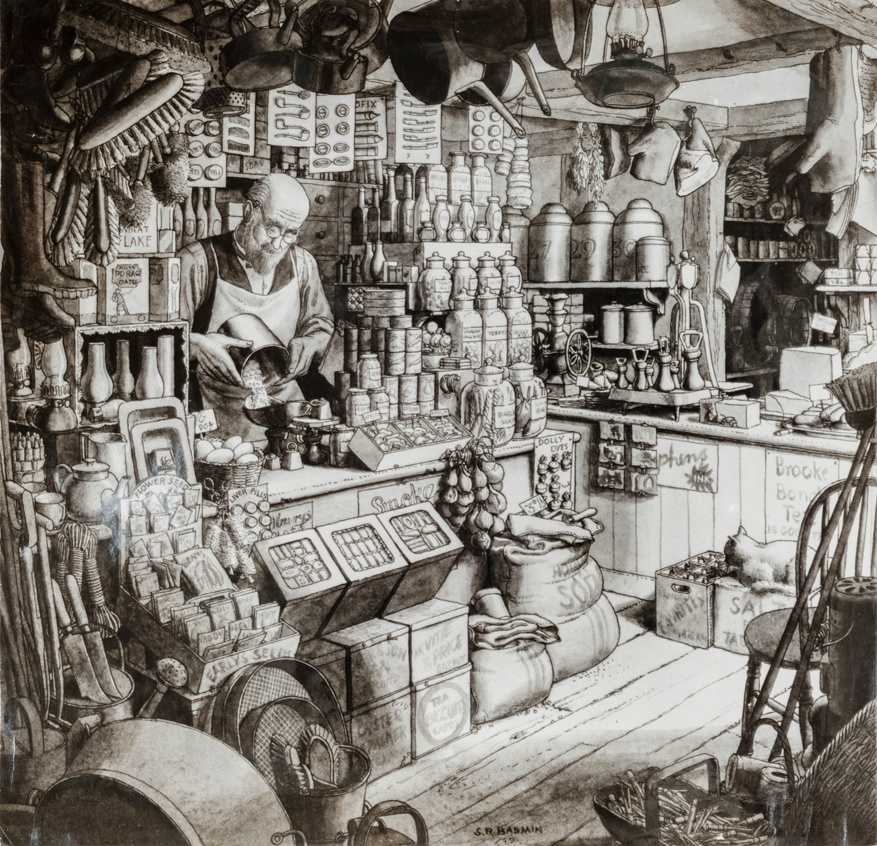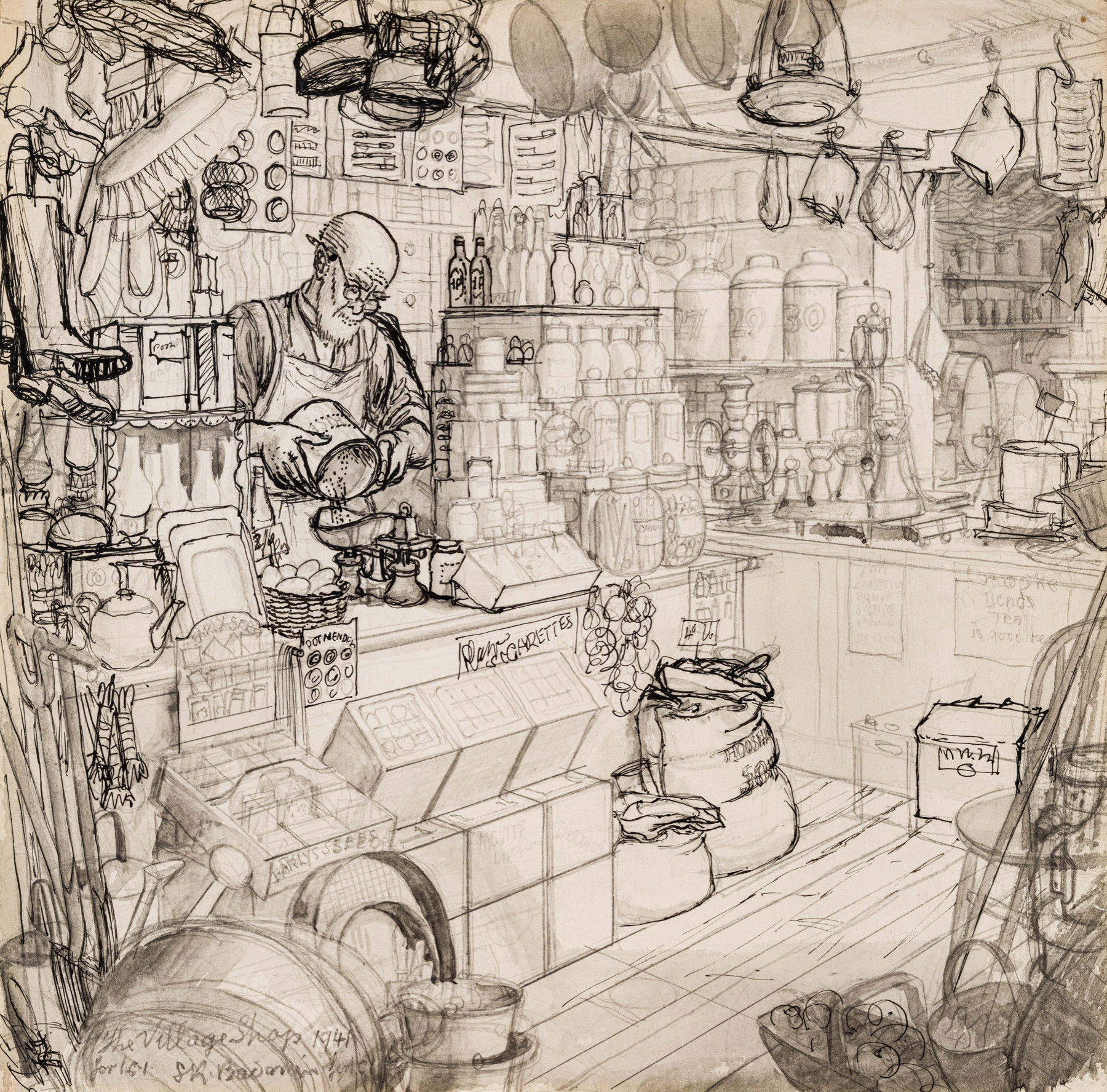 Finished ink drawing was exhibited at Lannard's Gallery, Billingshurst, 1988, no 9 as 'The Village Kew Shop'