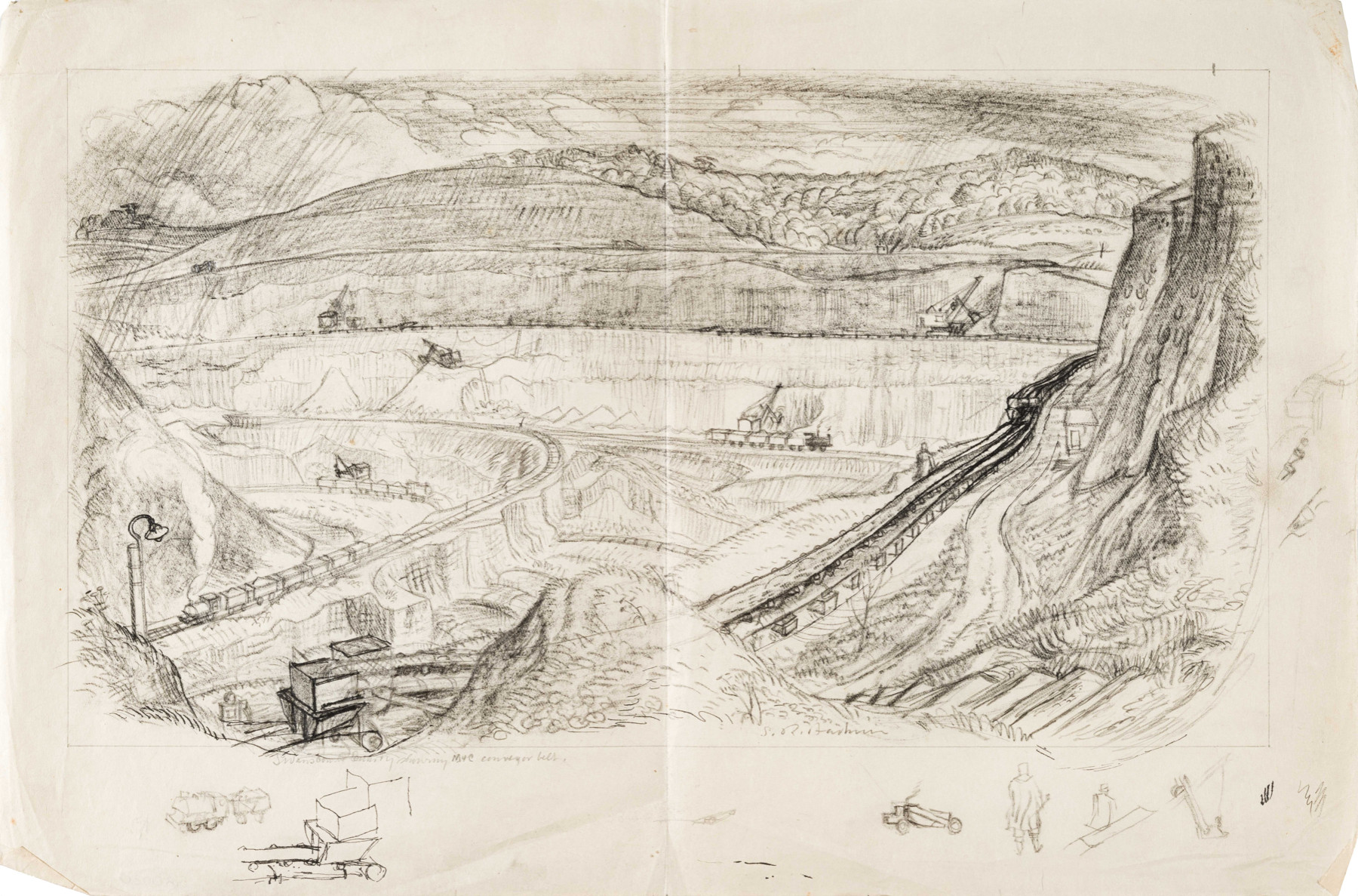 Swanscombe in Kent was one of the largest cement quarries in Europe, it operated from 1792 until it finally closed in 1990. it is now the site of the Bluewater Shopping Centre. Mavor and Coulson (M&C) were Glasgow manufacturers of mining equipment, in 1940 they made a sectional belt conveyor, as illustrated by Badmin here. Because of the prominence of the M&C conveyor belt, It is likely that Badmin was commissioned by them to produce an advert, of which this is the preliminary drawing.